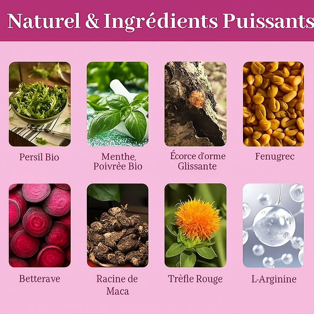 écorce d'orme glissante, Vitamine E, Trèfle rouge, Feuille de persil bio, chlorophylline cuivre-sodium, Feuille de menthe poivrée bio, Pectine végétale, Arôme naturels de fruits rouges, Acide citrique, huile de coco biologique, cire de carnauba.